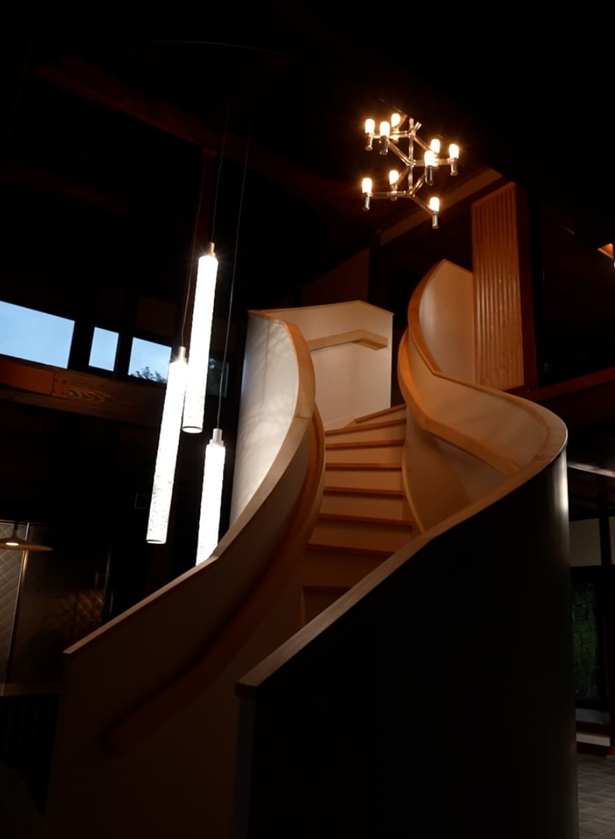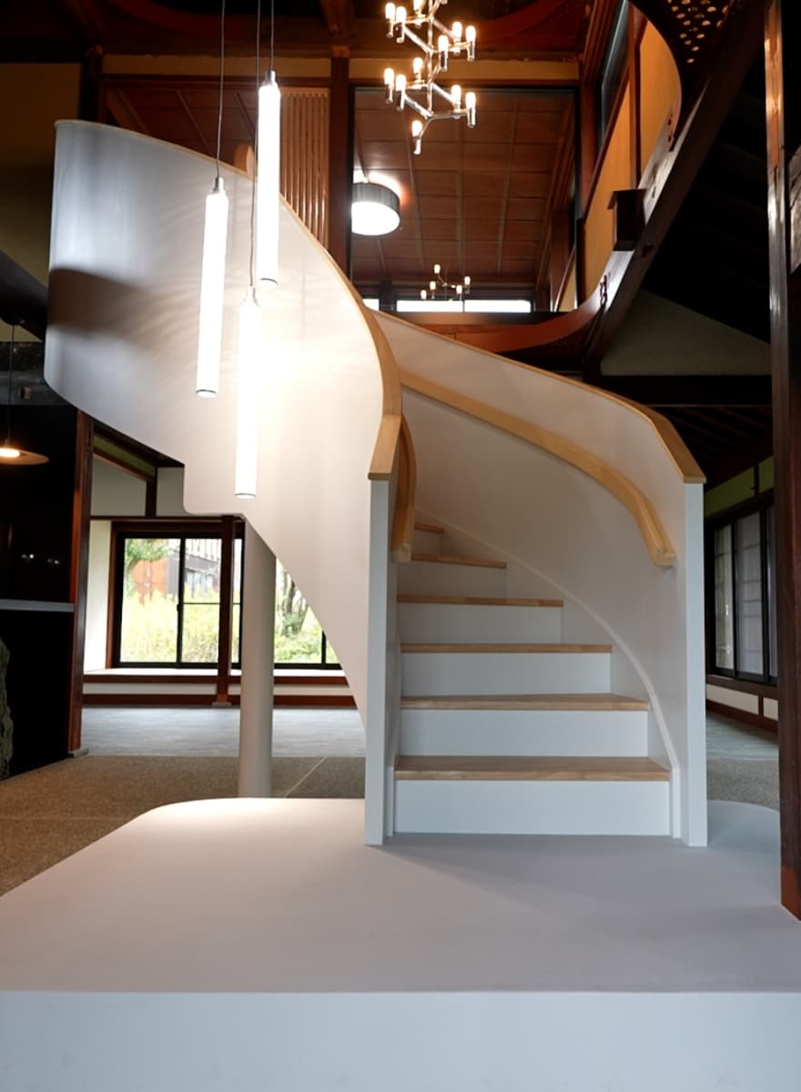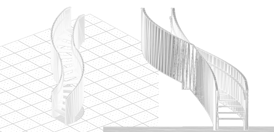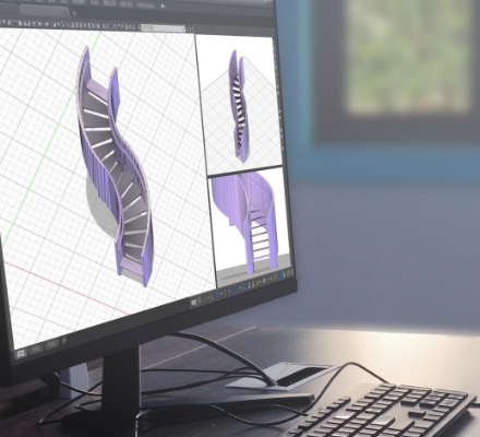 両側のカーブが異なる美しいラインが人を魅了します。3D CADによる階段製作。
