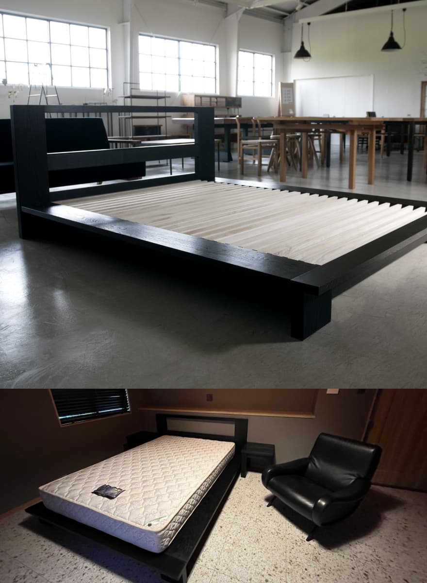 フランクロイドライトの好んだ大谷石調の床に黒のベッドを合わせました。